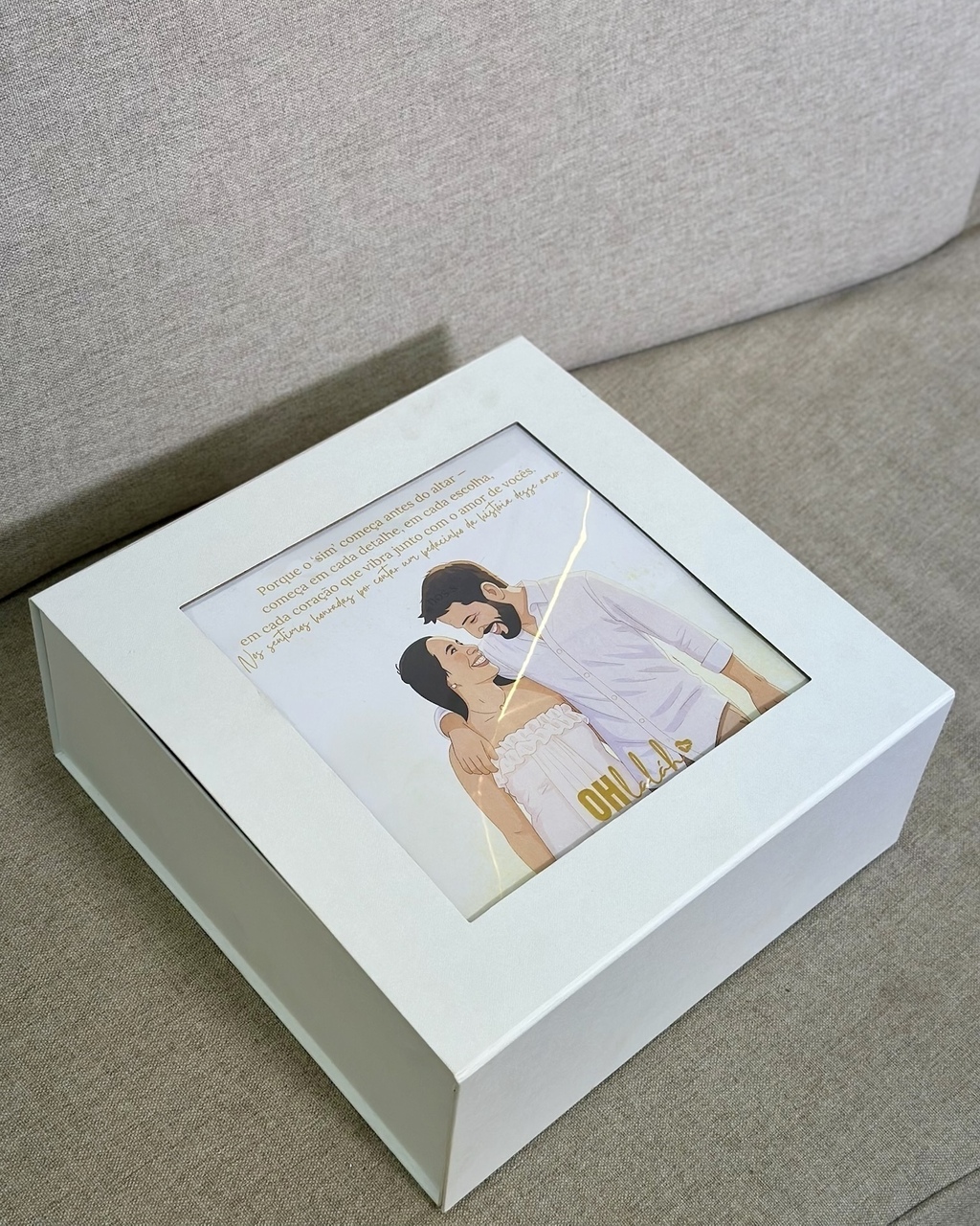 Após a confirmação da sua compra, nossa equipe de design entrará em contato com você pelo WhatsApp para tornar tudo ainda mais especial. Vamos solicitar as fotos das madrinhas, o monograma do casamento e outros detalhes personalizados. Com esse material em mãos, daremos início à criação das embalagens exclusivas, que seguem para produção logo após a sua aprovação.
